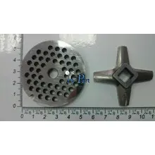 Ножи и решётки мясорубки PHILIPS Суть работы мясорубки такова: в отверстие мясоприемника подаётся продукт, затем шнековый вал подминает и проталкивает мясо к ножу и решётки, которые подобно ножницами смыкаются в ровные углы ножа и решётки, выдают желаемый фарш, будь то паштетный, котлетный или рубленый. Стоит отметить, что решётка выполняет немаловажную в переработке мяса функцию неподвижного ножа. Зачастую заменяют решётку №2 (мясную), диаметр ячейки которой составляет 4-5 мм, т.к. она чаще других используется